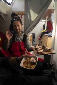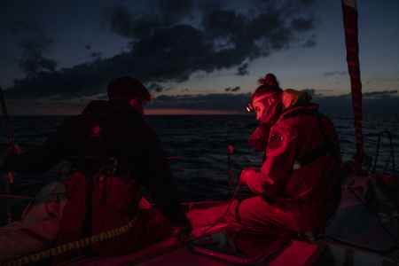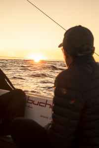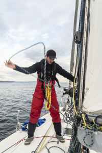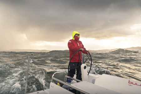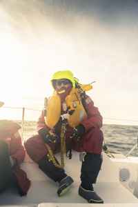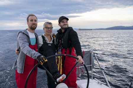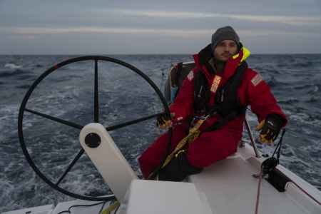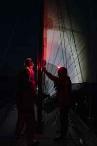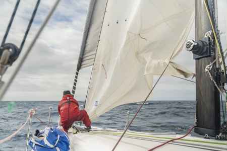 Ces premiers jours passés au près dans des vagues qui tabassent mettent l’équipage rudement à l’épreuve alors qu’il vient à peine de partir. La tempête, la fatigue qui mène à des erreurs de navigation et la chute de Fabienne obligent le navire à se réfugier en Galice. L’incertitude n’entrave toutefois pas la motivation de l’embarquée qui, dans un dernier sursaut, fend les remous d’une houle violente pour se sortir des turbulences…