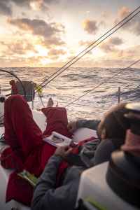 Les épreuves de la navigation ont beaucoup sollicité le navire et l’équipage. Alors que ce dernier se relaie dans des quarts mouvementés, d’aucuns doutent et se mettent à rêver d’ailleurs, d’autres prennent en main les rênes du navire. Mais c’est sans compter les premiers dégâts subis par les voiles et cordages qui nécessitent d’effectuer des réparations acrobatiques. Malgré ces revers, la mer finit par révéler sa poésie fascinante…