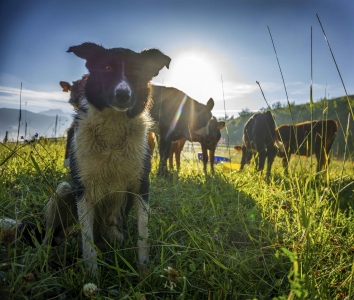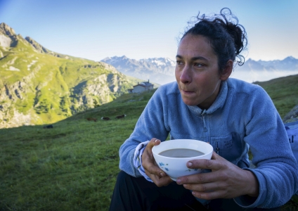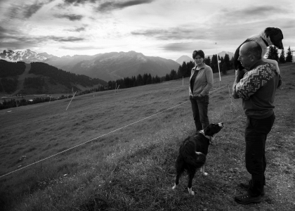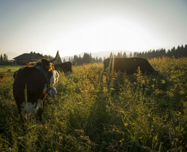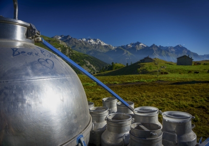 Chez les Bibollet de la Frête, près du col des Aravis, l’on ne sait où donner de la tête. Les falaises calcaires et abruptes dominent le petit alpage qui se blottit sur lui-même face à l’imposante masse du Mont Blanc. L’eau du bachat, les sapinières noires ou les volutes du ciel : tout y vibre de la présence du sommet légendaire. Enceints de sous-bois qui embaument les girolles, Claude et Nathalie y sont d’autant plus inspirés pour guider leurs bêtes. Riverains de la Haute Savoie, ils destinent leur lait qui au beaufort et qui au reblochon…