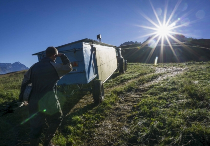 Sur les hauteurs lumineuses de Valfréjus, à l’alpage du Lavoir, la famille Martin Fardon investit des espaces autrefois dédiés à la ligne Maginot. L’immense caserne cuivre qui les loge tous résonne d’une régularité presque militaire, qu’il s’agisse du réveil pour la traite à 4h ou de la manipulation des meules le soir. Le grand Eric, inépuisable maître fromager, y est aidé de Dominique au regard de tzigane et de Frédéric à la voix chantante. Face aux neiges de la Dent Parrachée, côtoyant l’âpre massif des Cerces, nos bergers d’Icare s’y consument quotidiennement au soleil des lieux…